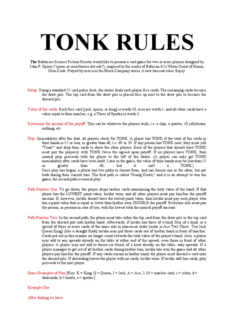 You must know the amount of the stake if. Tonk is a relatively fast-paced game that can be played by 2-4 players. Tonk is played with a standard deck of 52 playing cards and each card has a point value in the game.